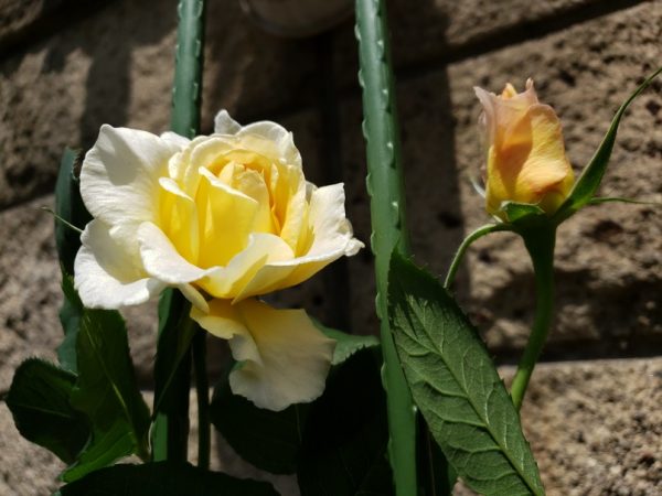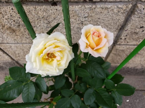 最初に咲いた黄色い花の隣に、2輪目の花が開いてきました。柔らかいイエローに、淡いオレンジがかった赤(朱色?)がほんのりと載る感じです。我が家は今まで、いかにも”これがバラだ!”というイメージの品種が多かったのですが、こういう優しい感じのバラも素敵だなと思いました。
