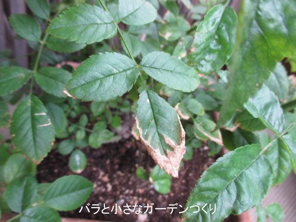 何枚か葉先が枯れています。横浜という土地柄、おそらく塩害だと思います。ホースで塩を洗い流してあげたいところですが、残念ながら外水道がないので、ニームオイルの希釈液をたっぷり噴霧するていどの対処です。