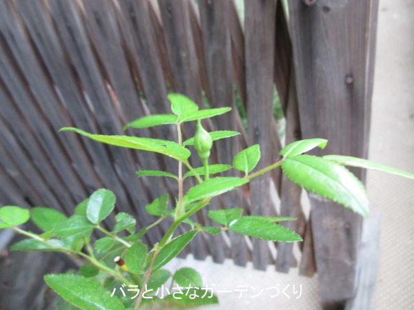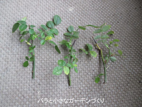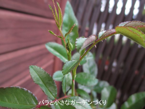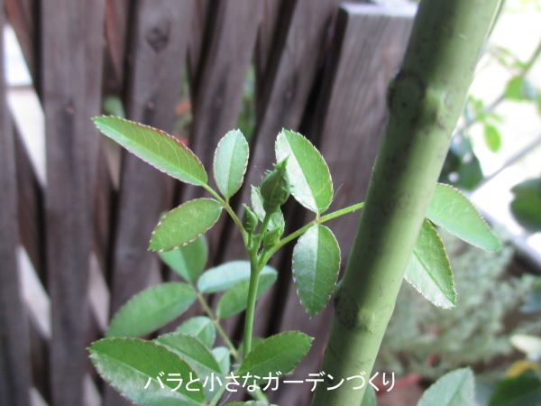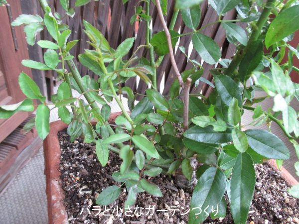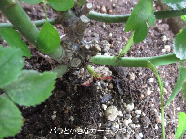 よく見ると、株元に小さなベイサルシュートが出ていました。ポッキリ落とさなくてよかったー(^^; 「ピンクマザーズディ」はとても樹勢が強く、新芽がたくさん発生します。1本の枝に3つも4つも新芽が出るので、少し芽かきをしたほうが良さそうです。