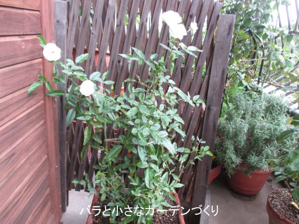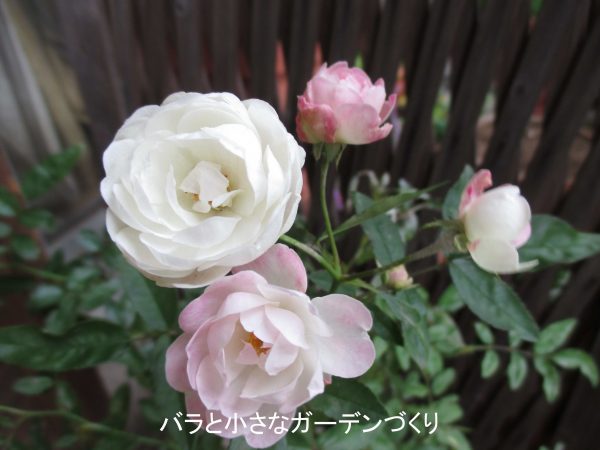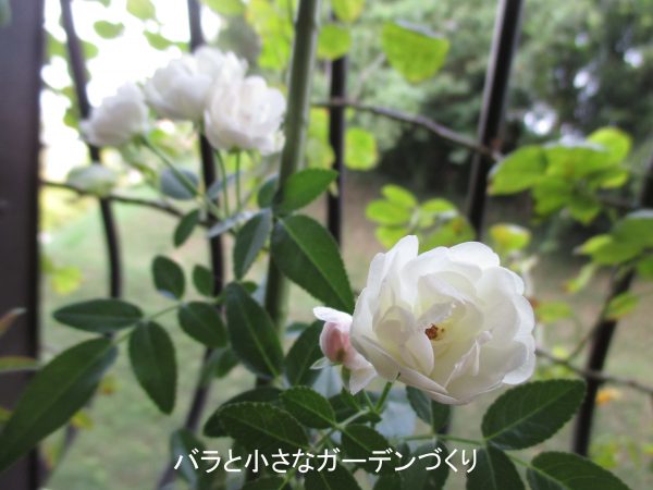 花色は、つぼみから咲き始めは淡いピンク色で、咲き進むと白になります。気温が下がると色が濃くなるタイプのバラもあるので、もう少し様子を見ようと思います。