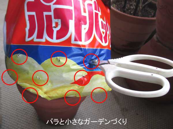 土袋をハサミで刺して水抜き穴を開けます。土袋の側面は下側に2段で穴を開け、底にもいくつか穴を開けます。
