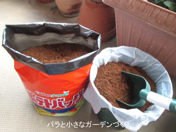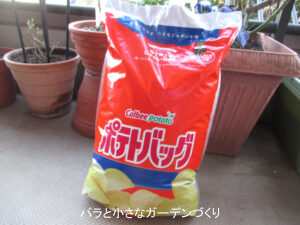 カルビーのポテトチップスの袋そっくりなパッケージの「ポテトバッグ」。今回は、これを使ってジャガイモを植えます。なにも「ポテトバッグ」でなくても、普通の土袋を利用しても構いません。まず植え付け手順の紹介から。