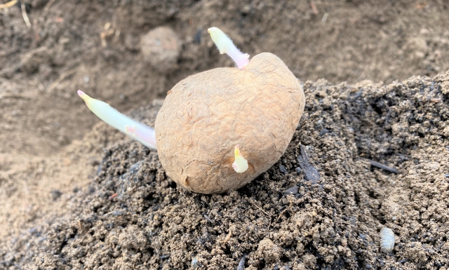 ▲芽が出た食用イモを種イモにすることは可能だけど・・・