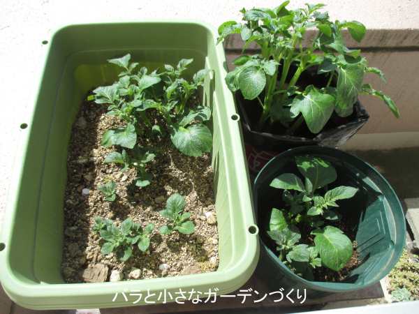 前回から3日しかたっていないのに、ジャガイモの芽がぐぐっと伸びてきました。芽が伸びてきたら、芽かきと追肥、土増しをしていきます。追肥は前回やっているので、今日は芽かきと土増しです。
