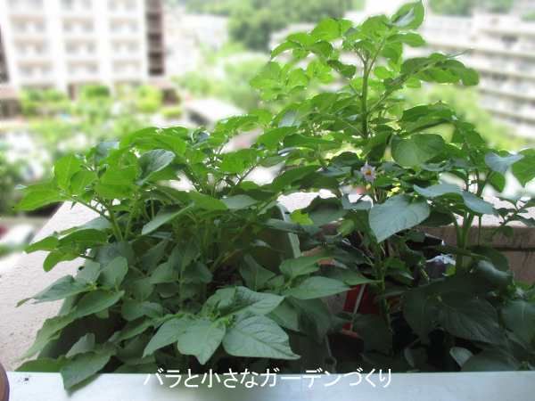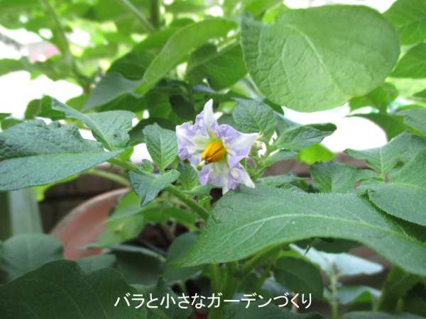 じゃがいもの花が1輪だけ咲きました。白というより薄紫の花でした。花の寿命は短く1日花かな? 蕾らしきものがいくつもあるのですが、意外と開花する気配がなく、咲いたのはこれ1輪だけでした。