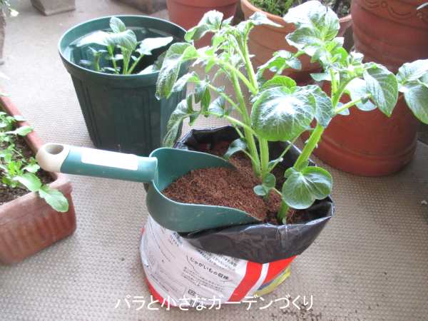 芽かきが終わったら土を足します。できたイモに日光が当たらないようにするためです。ポテトバッグの芽は、少し徒長ぎみに見えたので、土増しすることで倒れる心配が減りそう。