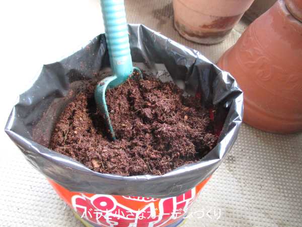 底ができたら土袋を開封し、中の土を半分以上取り出します。土袋の端は外側にくるくる丸めるように折り込んでおきます。この土には元肥が入っているので、何も追加せず使います。