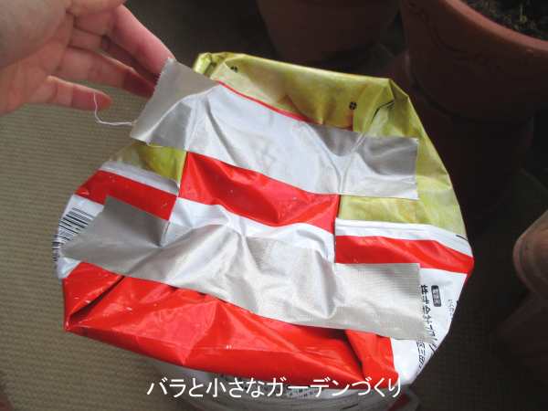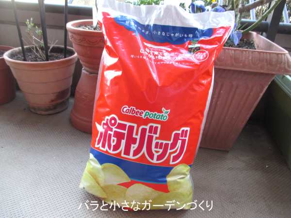 カルビーのポテトチップスそのままのパッケージデザインの「ポテトバッグ」を使って、ジャガイモの土袋栽培を試してみました。