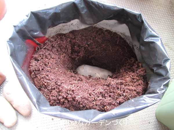 用意した種イモは十分大きかったんですが、切り分けても植えるスペースがないので、そのまま1個だけ植え付けます。種イモの上5cmほど土をかぶせたら、植え付けは完了です。