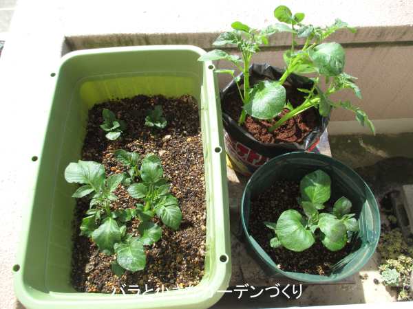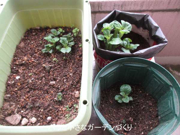 メークインの種イモは4個あったので、長方形のプランターに2個、ポテトバッグに1個、8号鉢に1個植え付け、室外機置場に設置しました。