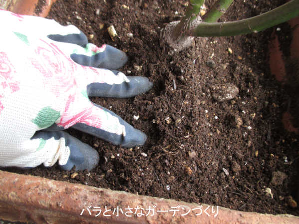 バラは少し重いめの土を好むので、この培養土に赤玉土を足して使います。