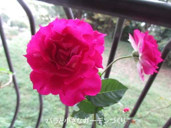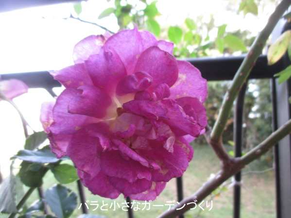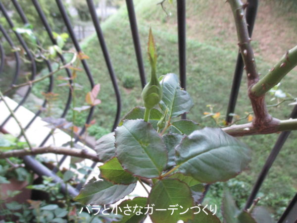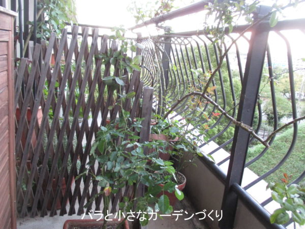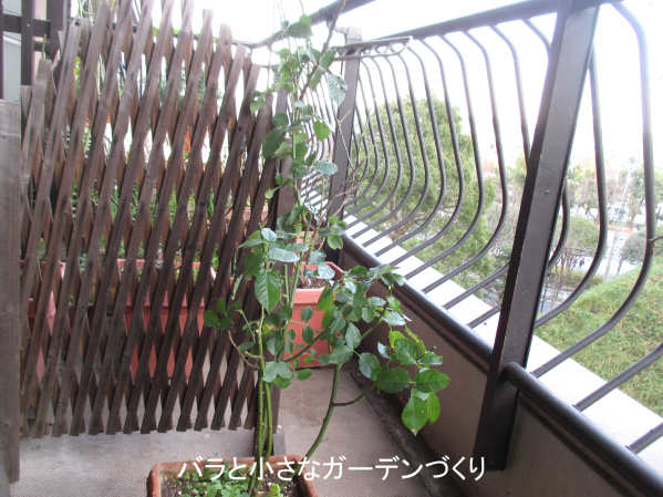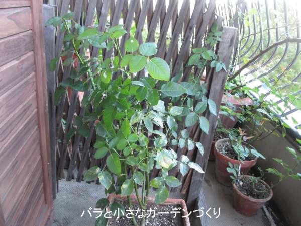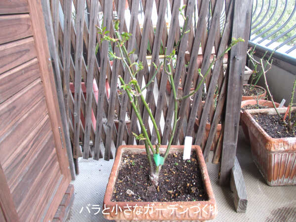 夏剪定後、今年発生したベイサルシュートから新しい枝がぐんと伸び出し、その先に開花しています。去年までの枝はまったく動きがありません。樹高は90cm。我が家のベランダでは、木立ちバラはこれくらいの高さまでに抑えたいところです。