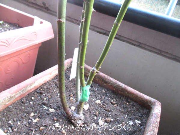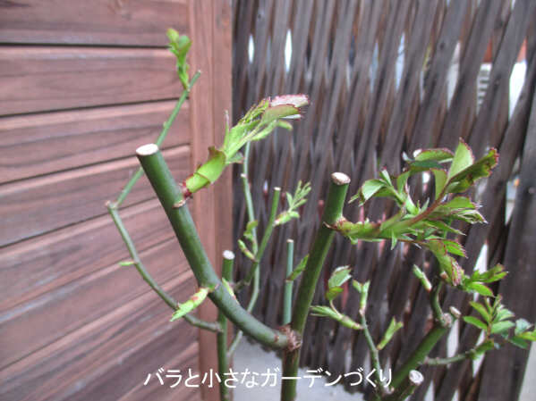 昨年末に剪定した「シェエラザード」が芽吹いてきました。力を入れたつもりはなかったけれど裂けてしまった枝もちゃんと芽吹いていて、とりあえず一安心。養生テープはそのままにしておきます。