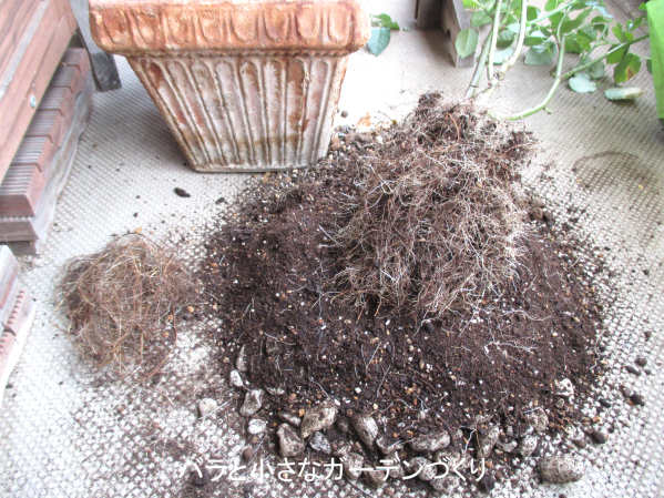 根をほぐして、根の間の土を落とし、伸びすぎた根をカットしました。けっこうたくさん切りました。