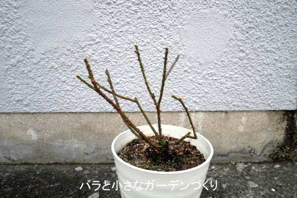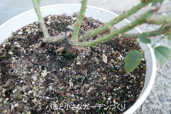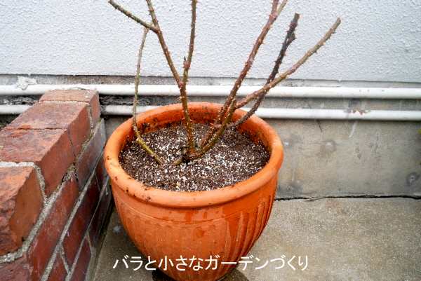1/22 鉢替え。根洗いをして癌腫の有無を確認した後、以前より小さめの鉢に植え替えました。寒肥として「RSKバラ園バラの肥料」(松栄産業)を少量。土は「バラの培養土」(相原バラ園)を使用。