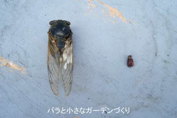バラの周囲で見つけた容疑者は上の2者。クマゼミは根頭癌腫病と関係なさそうなので「コガネムシ(マメコガネ)の幼虫に根を食べられて、それが原因で株が弱り癌腫