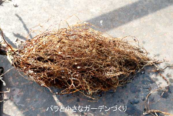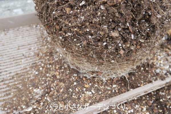 「リヴレス」と同じように、「ソワイユ」もやっぱり抜けない! この鉢は口元が少し狭まっているので、余計に抜けず四苦八苦。5分ほど格闘して何とか抜けたけど、根鉢が多少崩れてしまいました。そして、「リヴレス」同様にやっぱり鉢底石が根に取り込まれている・・・。