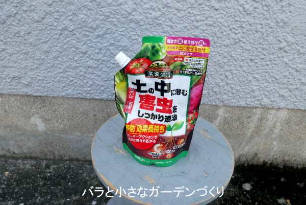 コガネムシの幼虫対策として、全てのバラに「ダイアジノン」を撒きました。今後どうするか未定ですが、まずはコガネムシ幼虫に効く薬剤を撒