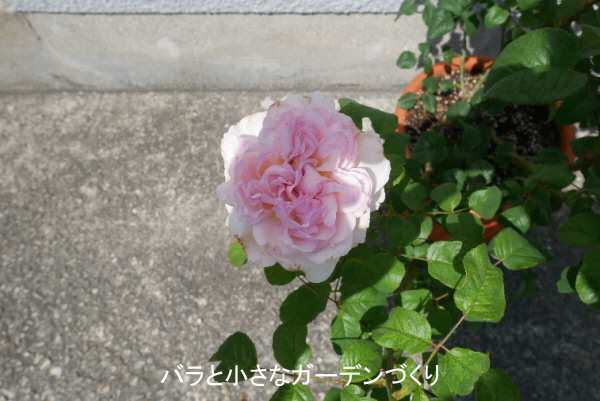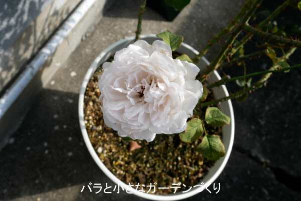 そんななか、夏花を咲かせてみました。花びらの縁が少しピンク色の白い花が咲きました。セミダブル咲きで、香りは爽やかなダマスク系の強香です。