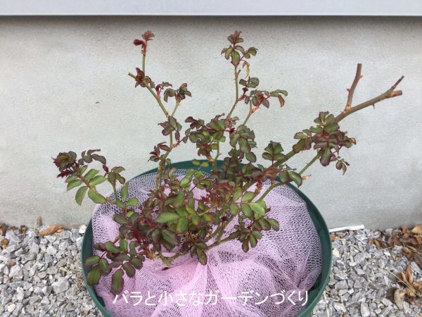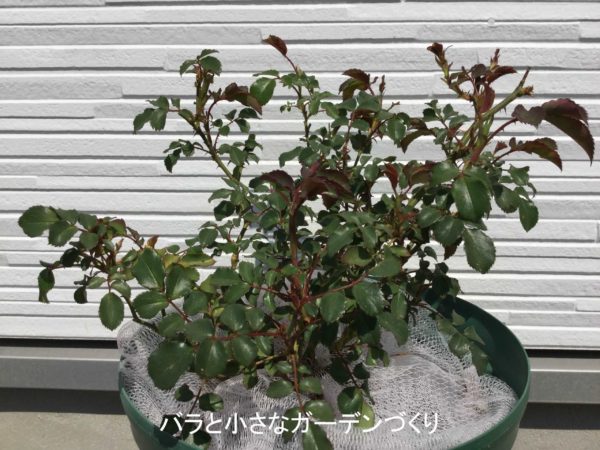 昨年、小さな新苗でお迎えして育ててきた株です。新苗到着時と秋口の2度鉢増しし、今年の3月15日に赤玉土小粒+バラの家「極上バラ培養土のもと」〜
