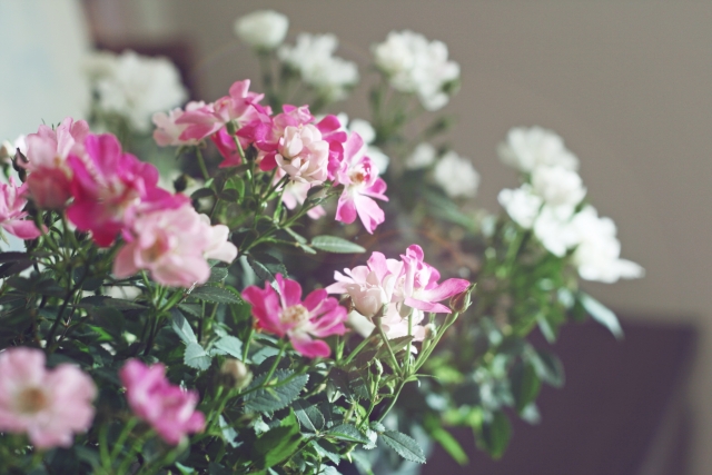 物が丈夫に育つためには、紫外線が必要です。紫外線の量が足りないと、植物はひょろひょろと背ばかりが高くなり軟弱に育ちます。室内でもバラを咲かせようと思えば、とても陽当たりのよい窓辺で、レースのカーテンもつけずしょっちゅう窓を開けているようでなければ難しいようです。
