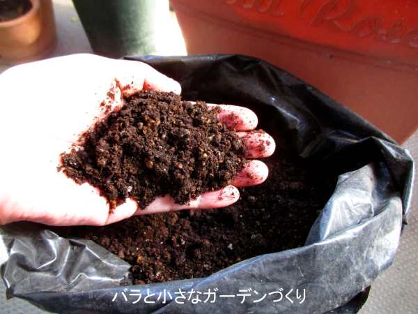 じつは昨年の暮れにつくった「リサイクル・バラの土」は、ここで紹介した配合にさらに、アルカリ性になりやすいベランダの土を酸性に戻すためにピートモスを少量入れ、せっかく購入したからという理由でパーライトも少し入れました。