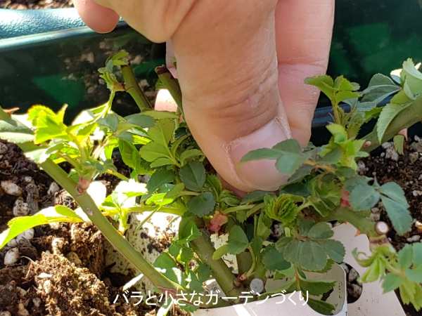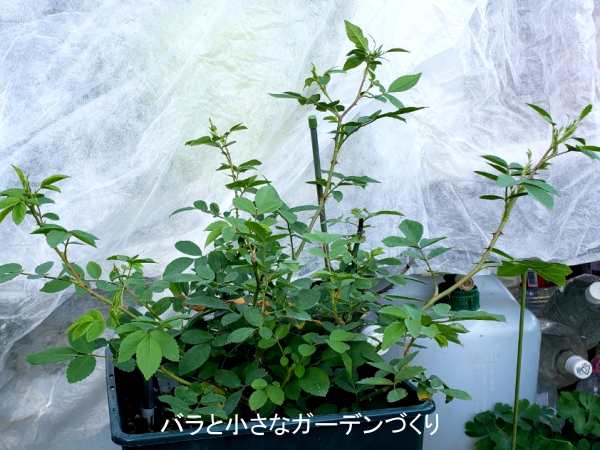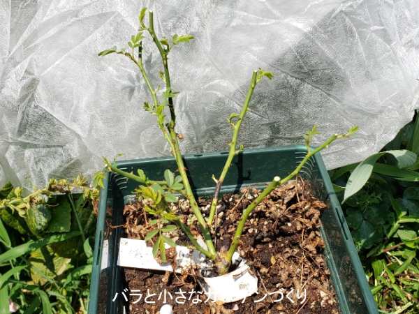 芽吹きを良くするため「バイオゴールドセレクション・薔薇」(タクト)を規定量15粒のところ、2年間効果のある元肥が入っているので半量の7粒撒きました。さらに水やりの水に「ストレスブロック」「ハイポネックス顆粒」(ともにハイポネックス)を混ぜて潅水しました。