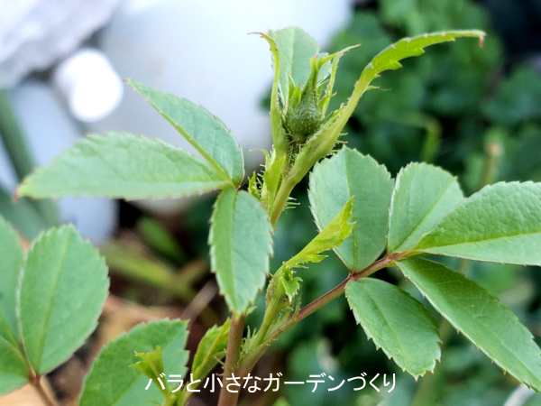 冬の植え替えで使った培養土「わくわくローズソイル」には緩効性化成肥料が少し入っているのと、元肥を規定量の半分入れているので、芽出し肥も少なめにします。
