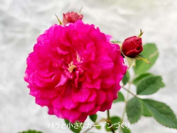 小さいけれどよく目立つ、濃いローズ色の花で、花形はロゼット咲き。香りはやはり微妙かな? 枝が枝垂れるので、花台などに載せて、少し高いところに置くと映えそうです。