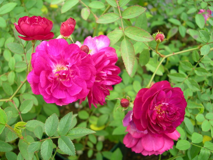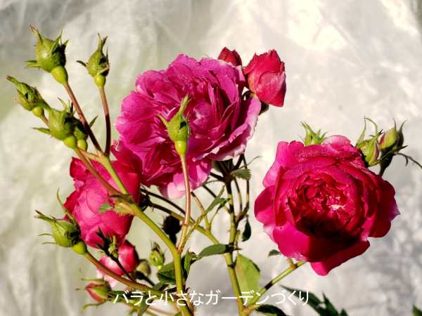赤紫に近い濃いローズピンク色で、花径3.5cmほどのロゼット咲きの小花を大きな房に咲かせます。