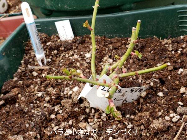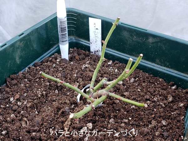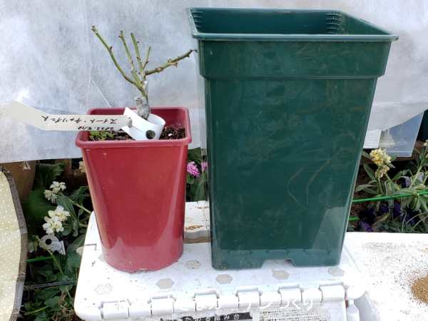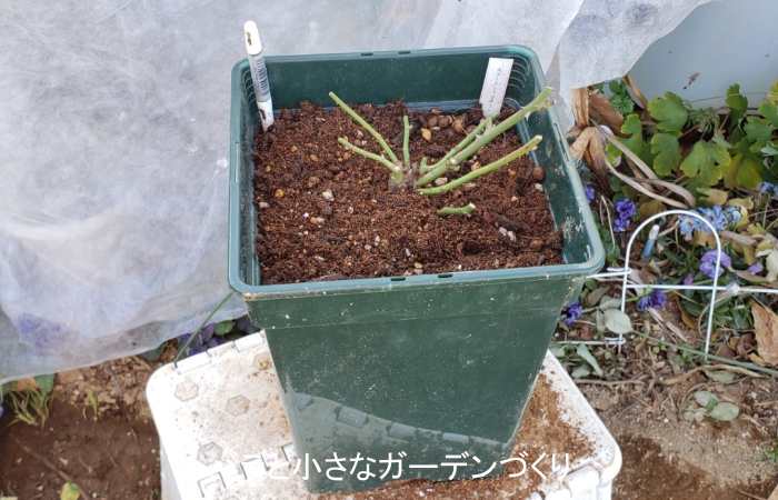 あらかじめ樹高12cmに冬剪定してある「スイートチャリオット」を、3号鉢→6号鉢にサイズアップして植え替えします。