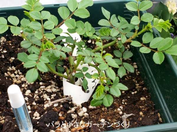 「わくわくローズソイル」には緩効性化成肥料が少し入っているのと、いずれ芽出し肥を与えたいので、元肥は規定量の半分にしました。