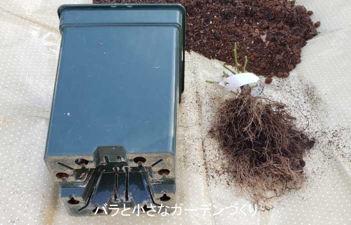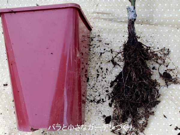 じつは初めてのミニバラということで、今回とくに気にしたのが土と根です。「スイートチャリオット」は、ミニバラのせいか、普通サイズのバラより根がコンパクトです。