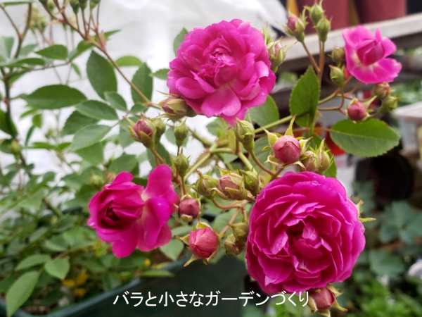 花は花径3cmのロゼット咲きで、やや紫味の濃いピンク色。枝先に数輪かたまって房咲きします。