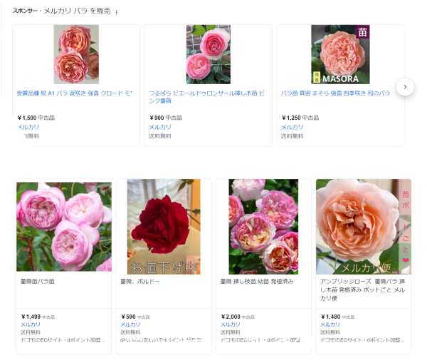 ほかに品種名の書かれていない出品もたくさんあり、ほとんど闇市のようなありさまです。こういう問題の多いフリマサイトでのバラ苗の入手は控えてください!