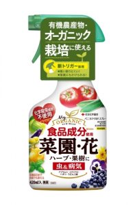 食品成分を使用した野菜やハーブにも使える殺虫殺菌剤です。デンプンで害虫をコーティングして窒息させるという方法の殺虫剤なので、人体にやさしい資材です。