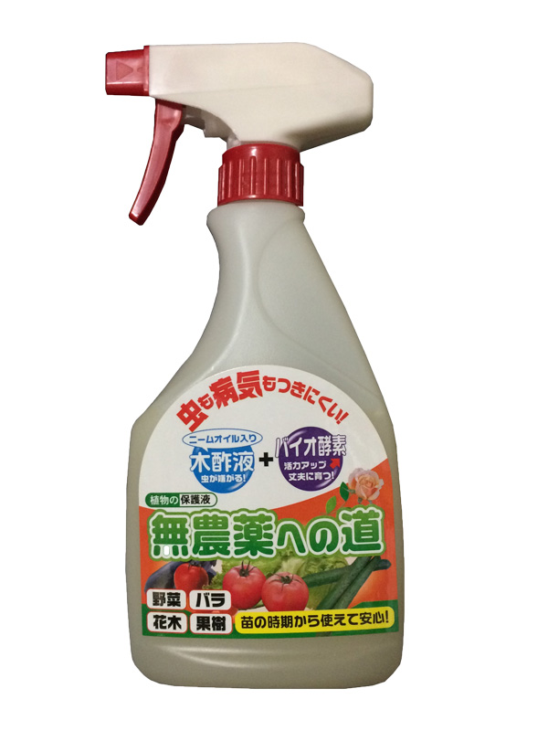 無農薬への道は、ニームオイルと木酢液の昆虫への忌避作用、病気の殺菌作用に加えて、バイオ酵素で植物を丈夫に育てるよう開発された商品です。