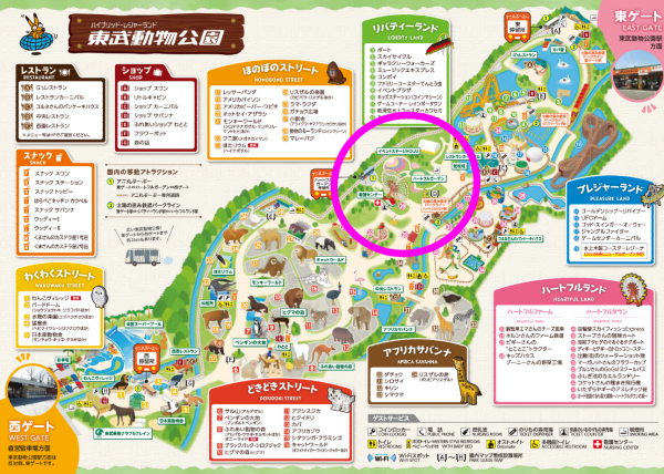 東武動物公園は、大きく3つのゾーンから構成されています。上の園内マップで分かるように細長い園内の中央から下半分が動物園ゾーン、上半分がさまざまなアトラクションがある遊園地ゾーン。一番下の西ゲート付近にプールの3ゾーンです。