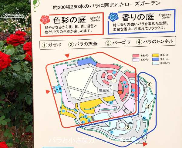 園内は花色ごとにバラをまとめて植えてある「色彩の庭」(赤ライン部分)と、とくに香りの良いバラを集めた「香りの庭」(青ライン部分)に分かれています。