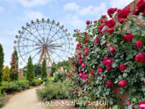 さらに、かわいらしい観覧車とバラが一緒に撮れるところが、このローズガーデンの魅力のひとつ。観覧車だけでなく、バラ園のデザインも美しく、どこを撮っても絵になります。ほかでは撮れない写真映えスポットですね^^