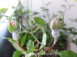 ウドンコ病は、バラにとてもポピュラーな病気です。ウドンコ病の原因はカビ菌で、風でカビの胞子が運ばれてきて発症します。ウドンコ病が発症したところは白い粉をふいたようになります。とくに発症しやすいのが新芽や若葉、つぼみ、若い茎などです。