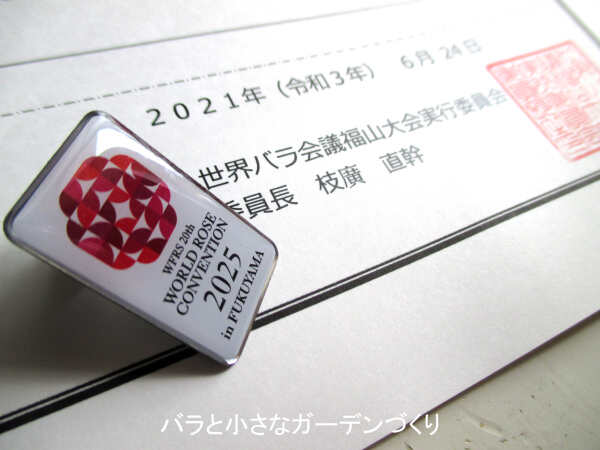 公式サイト掲載とともに、郵送で記念品が贈られてきます。記念品は2種類。「世界バラ会議福山大会2025 応援宣言登録証」と、大会ロゴのピンバッジです。