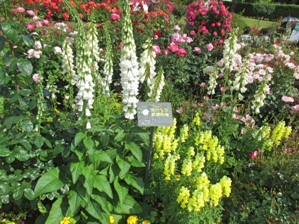 「黄花の庭」では、目にも鮮やかなレモンイエローのキンギョソウが咲いていました。この庭を代表するバラとしてピンク色の覆輪をもつクリームイエローのバラ「ピース」が選ばれています。