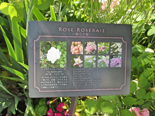 プレートには、この庭を代表するバラとして「フラウ・カールドルシュキ」と、バラ以外の植物が記載されています。