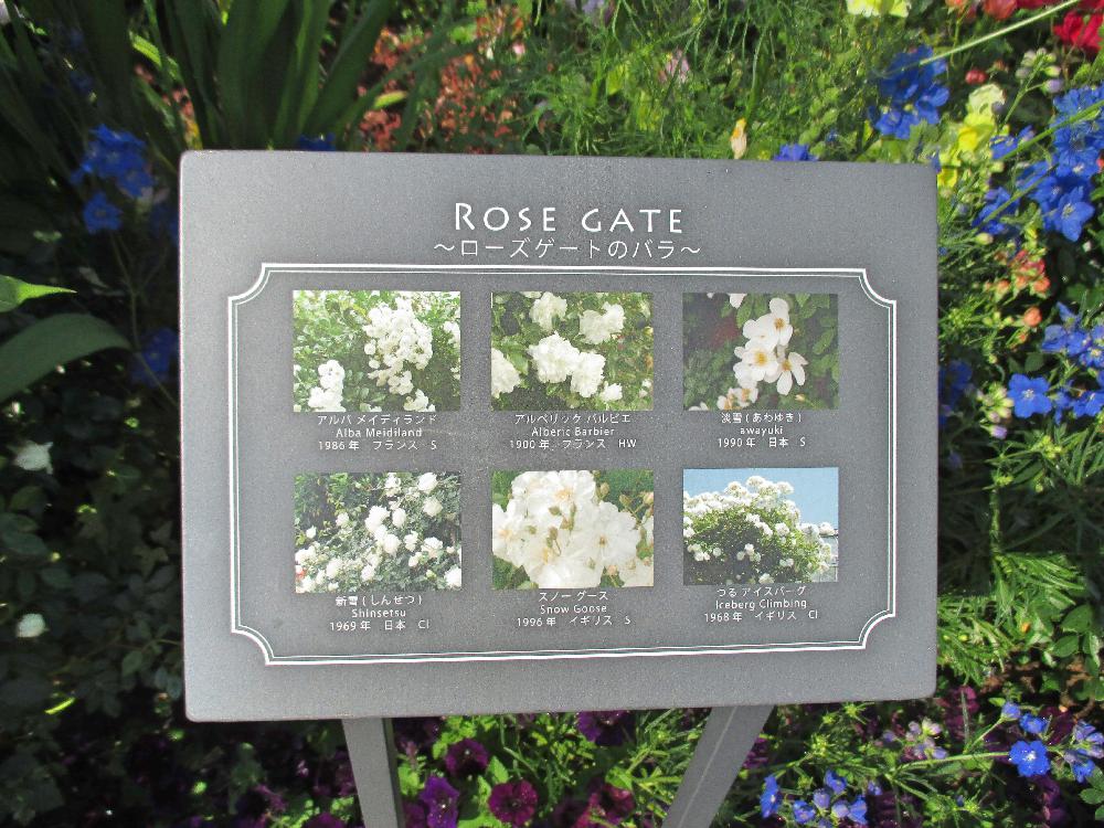 中心部分に植えられている白バラの品種が看板に記載されています。