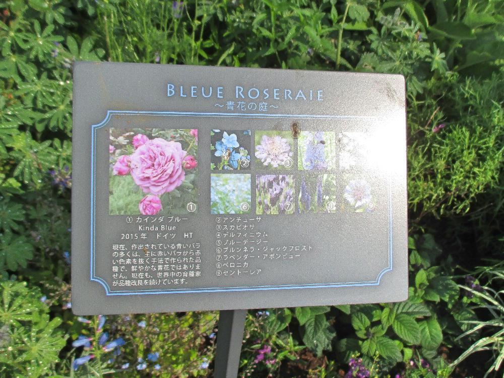 プレートには「カインダ・ブルー」などの青バラについての説明と、バラ以外の宿根草が記載されています。