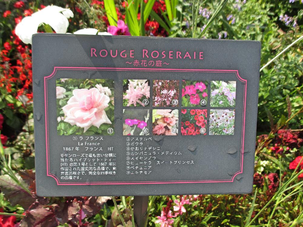 プレートには「ラ・フランス」についての説明と、赤花の庭に植えられている宿根草が記載されています。