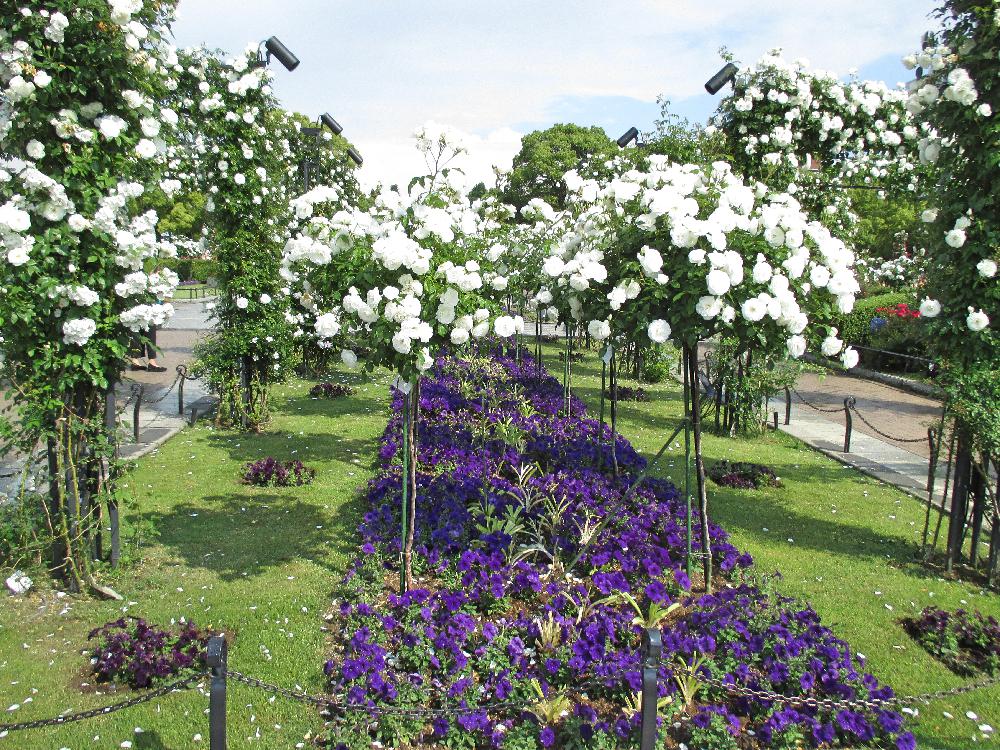 四角いアーチには数種類の白バラが咲きこぼれ、アーチとアーチの間には、傘を広げたように仕立てられた白バラのトピアリーが並びます。トピアリーの足元には紫色の花が! 白と紫の、色を抑えた整然とした景色は、とてもフォーマルで印象的です。