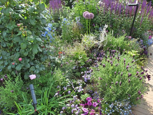 「青花の庭」は、「カインダ・ブルー」という2015年に作出された新しい青バラを中心に、さまざまな青や紫色の花をつける宿根草が組み合わされています。上の写真を撮影したときには、「カインダ・ブルー」が咲くには少し早かったようで、ほとんどつぼみでした。左側にかろうじて1輪だけ咲いているのがそうです。