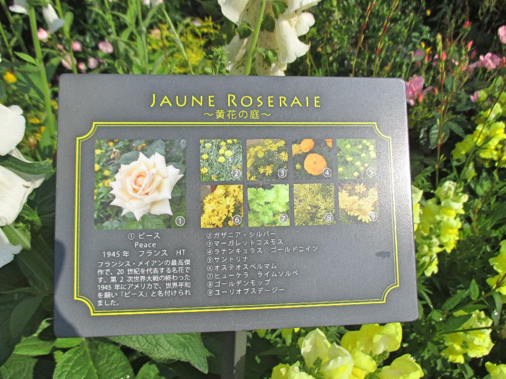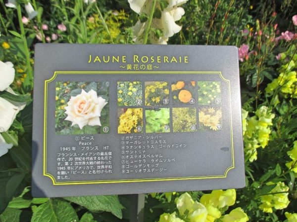 プレートには「ピース」の説明と、黄花の庭に植えらえている草花の種類が記載されています。